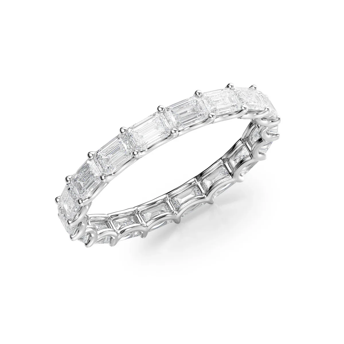 The East West Emerald U Prong Eternity Ring is a stunning testament to timeless elegance, featuring exquisite emerald-cut diamonds beautifully set in an east-west orientation. These dazzling stones are meticulously secured by sleek U prongs, showcasing the diamonds' brilliance and maximizing their visual impact. Crafted for those who seek a unique blend of classic and contemporary design, this eternity ring symbolizes everlasting love with unparalleled sophistication and style.