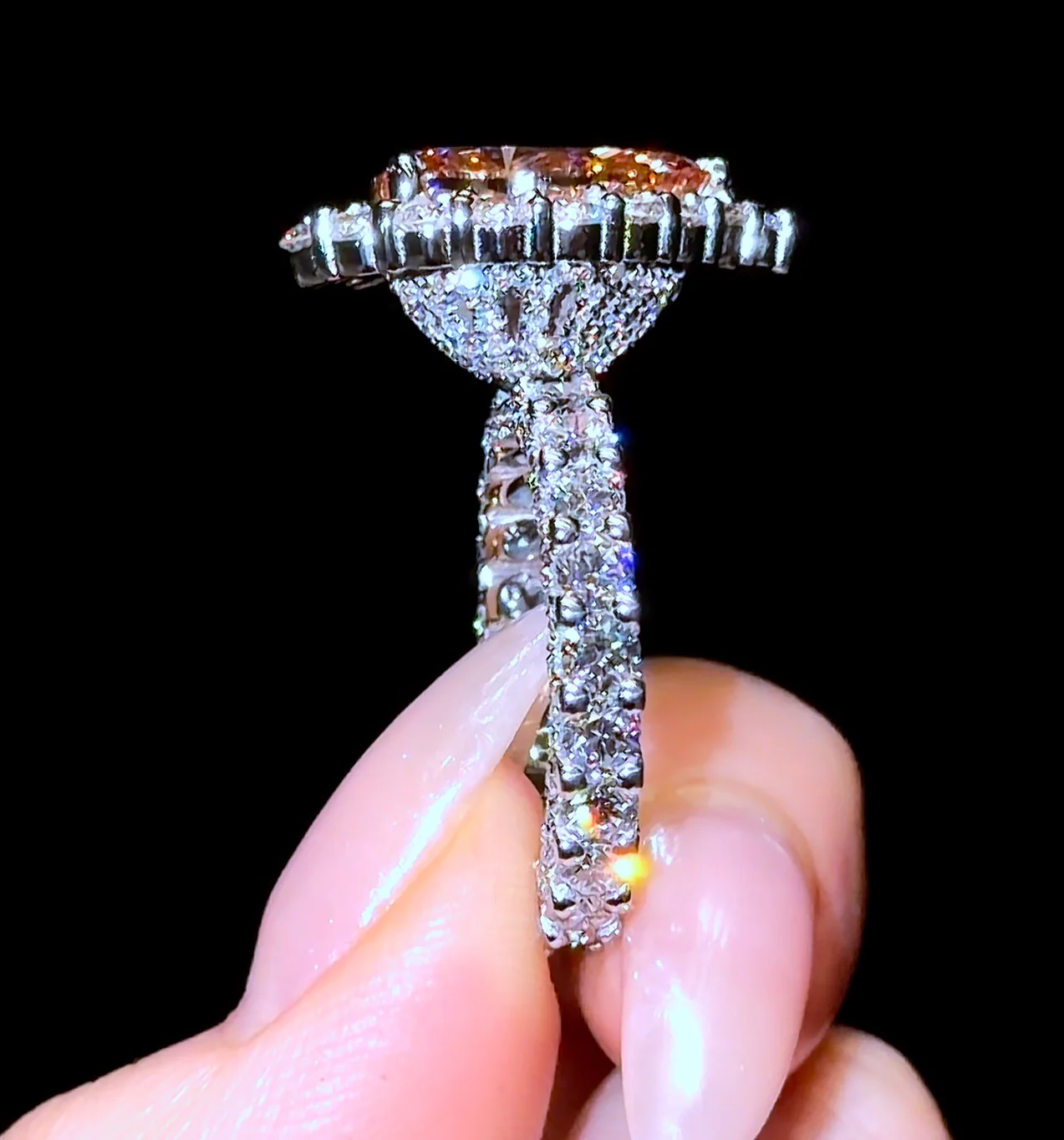 Our viral Traditional Oval Heiress Ring, Features a 2-Row Pavé Traditional Halo wrapping around the Oval diamond, with a MicroPave Round Eternity Band.