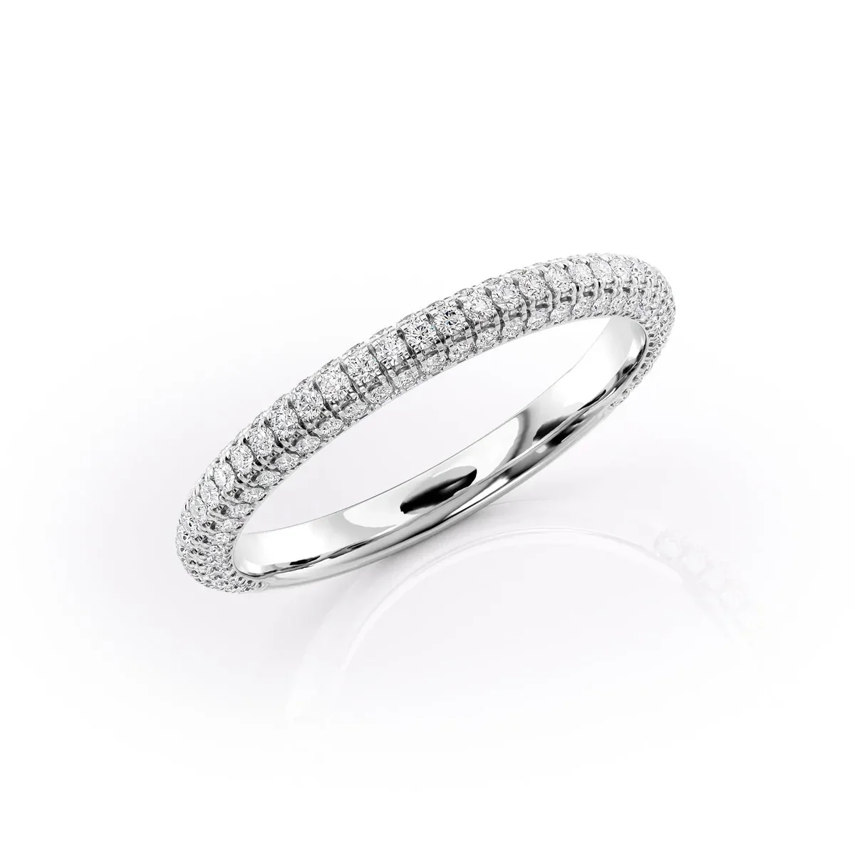 The ultimate in opulence and luxury. A unique pave ring lined with striking VVS diamonds all over, and on all sides: in front, above, and below. The band stacks with other bands and rings easily, and is the perfect piece for someone who admires and appreciates having a little extra.