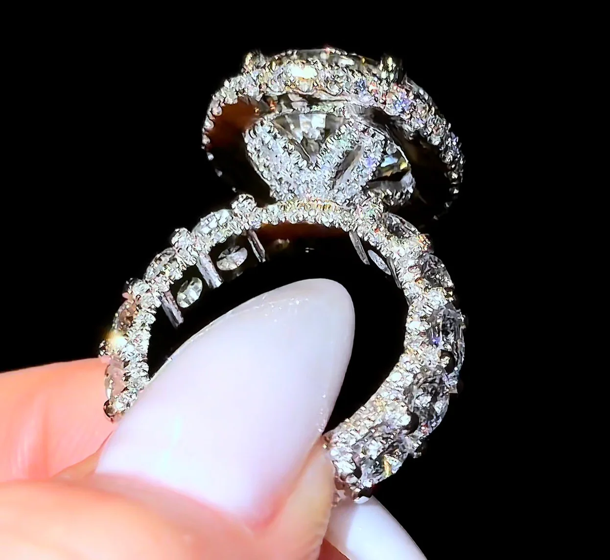 Our viral Traditional Round Flower Queen Ring, with MicroPave Round Eternity Band, a Double Row Pavé Traditional Halo, and Pave Flower Prongs underneath!